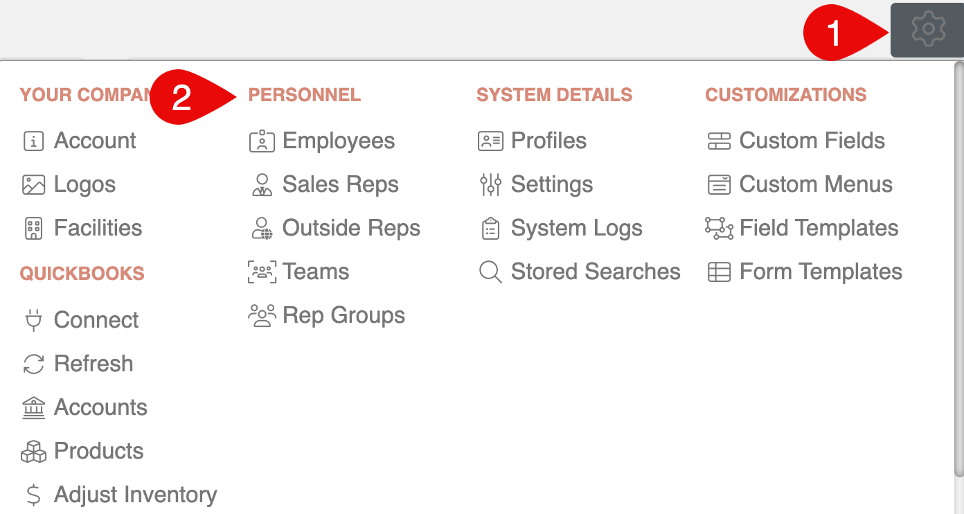 - In the gear menu at the top of the page, navigate to the Personnel. From this menu, any user can be added to your organization, whether they are general employees, sales representatives, or outside representatives:
